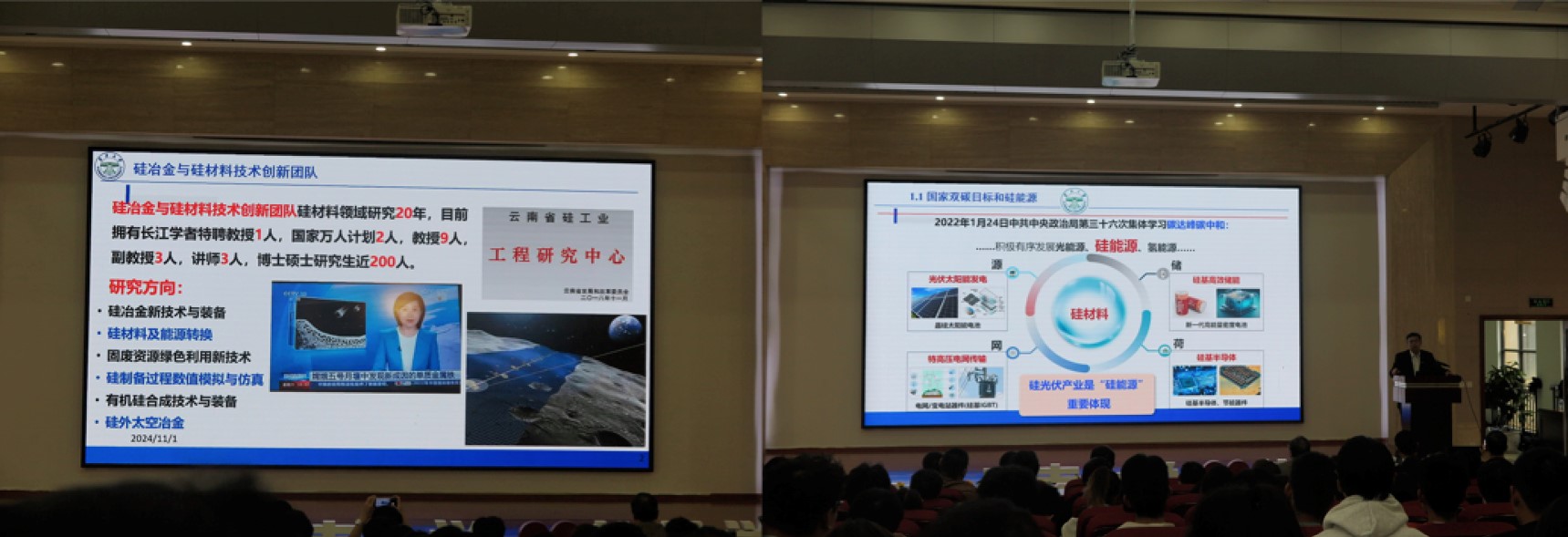 2024年11月1日下午2时,云南大学校长马文会教授在软件学院报告厅,为材料与能源学院材料科学与工程、新能源科学与工程两个专业的大一新生、全体一年级硕士研究生及部分教师,共计400余人,带来了一堂以“碳中和背景下硅能源技术进展”为主题的《材料社会人》课程。此次讲座由材料与能源学院党委书记张俊主持。